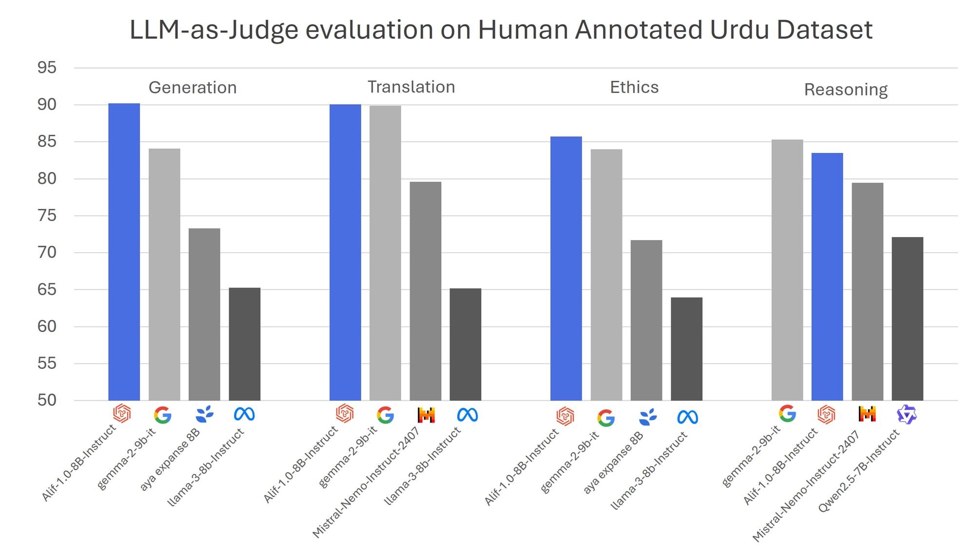 - State-of-the-Art Performance on a BudgetBy employing high-quality synthetic data distillation, we have enhanced Meta Llama 3.1 8B’s Urdu capabilities significantly. Alif now outperforms Meta Llama 3.1 8B Instruct in Urdu-specific tasks while maintaining strong English fluency. It also outperforms many open-source multilingual LLMs available such as Gemma 2 9B, Llama 3.1 8B, Mistral Nemo 12B, Qwen 2.5 7B and Cohere Aya Expanse 8B, all within a budget of under $100.